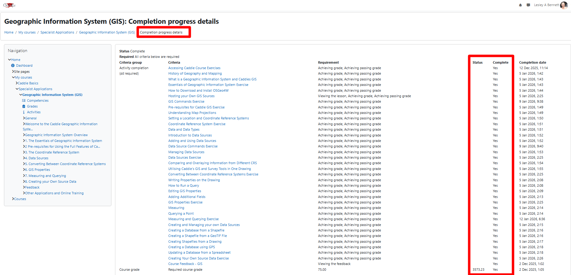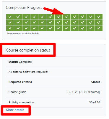 The Completion Status block can be expanded by clicking on 'more details'. Here you can see the course and associated lessons and activities to see your progress.